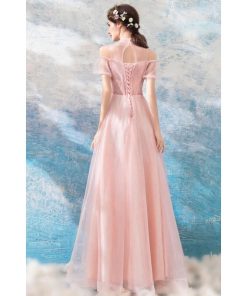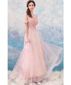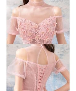 【ANGEL】スタンドカラー肌透けチュールレースパール半袖付き背中編上げAラインロングドレス【送料無料】高品質 ピンク ロングドレス パーティードレス