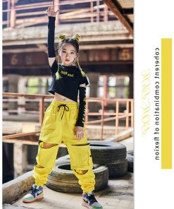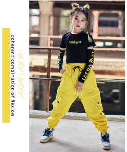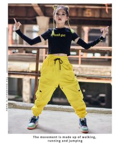 キッズ ダンス 衣装 へそ出し イエロー カーゴパンツ ヒップホップ 黒シャツ 女の子 ブラック 長袖 ロングパンツ ズボン トップス HIPHOP ジャズダンス 子供 ス