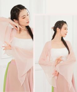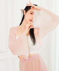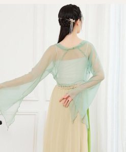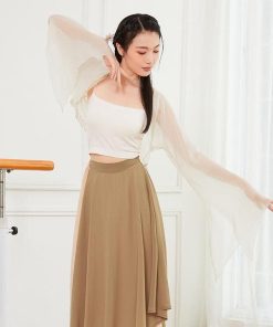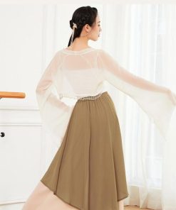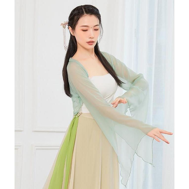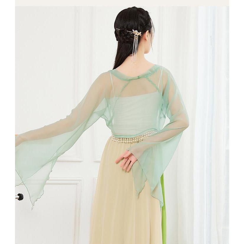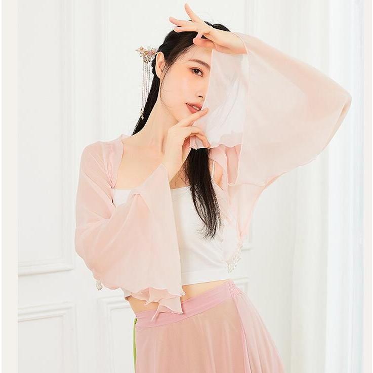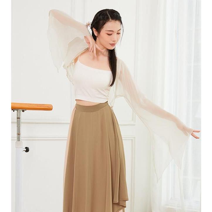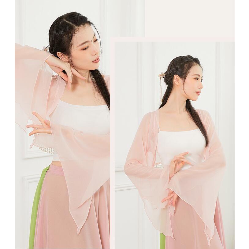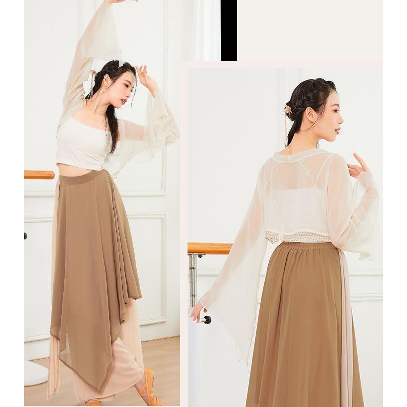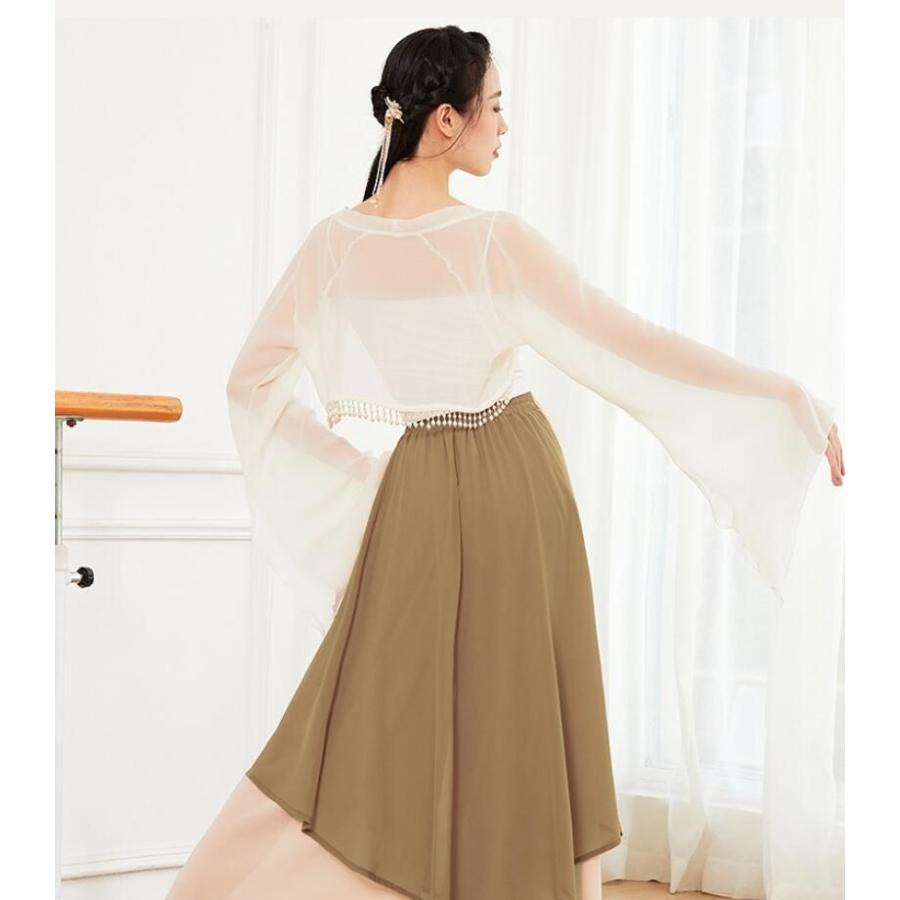 ダンス衣装 レディース 古典舞踊 中華民族ダンス 衣装 ひらひらの長袖 裾にパールストラップ エレガント 中国踊り 古典ダンス 練習着 レッスン着 柔らかい 飄逸