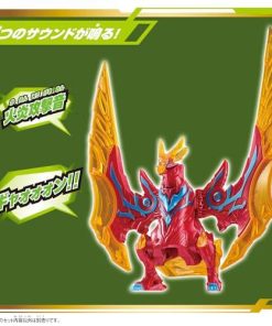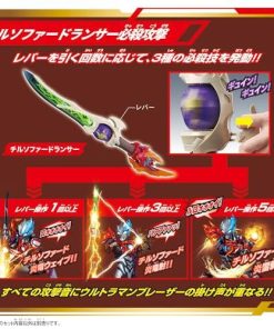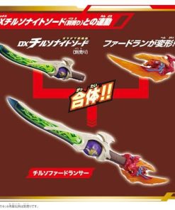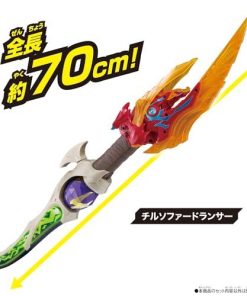 ・さらに、本体を変形して別売りのDXチルソナイトソードに合体させると、炎と雷の力を宿した最強の双刃剣チルソファードランサーが完成