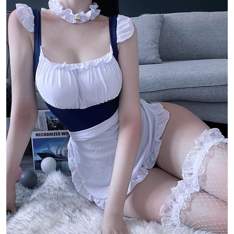 メイド服 コスチューム 3点セット レディース 女性 レオタード 首飾り チョーカー エプロン フリル 鈴 谷間見せ セクシー コスプレ
