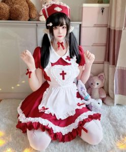 セット内容:ワンピース、エプロン、カチューシャ、ナース帽、チョーカー、袖留(画像参照)
