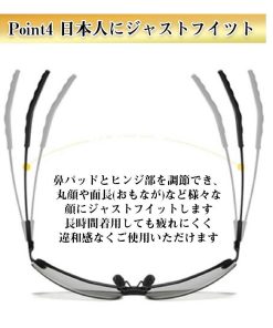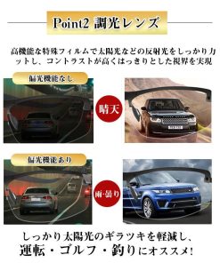 偏光は、物体から反射された光で、ぎらついた光のことです。当製品のレンズにはこの偏光をカットするレンズを採用しています。眩しいぎらついた光を防ぎ、クリアな視界を提供します。