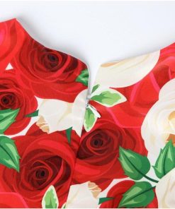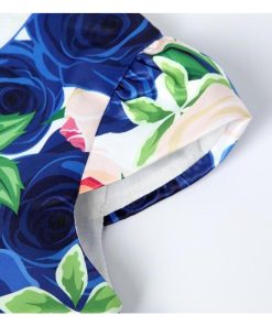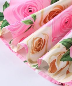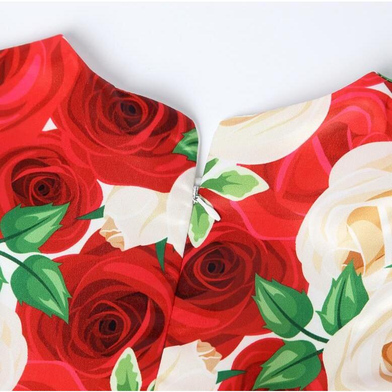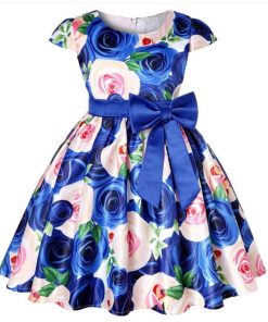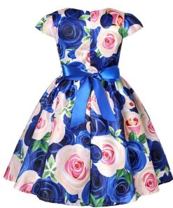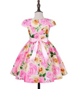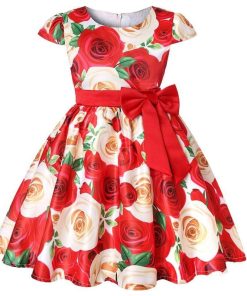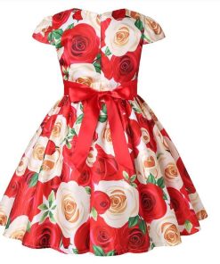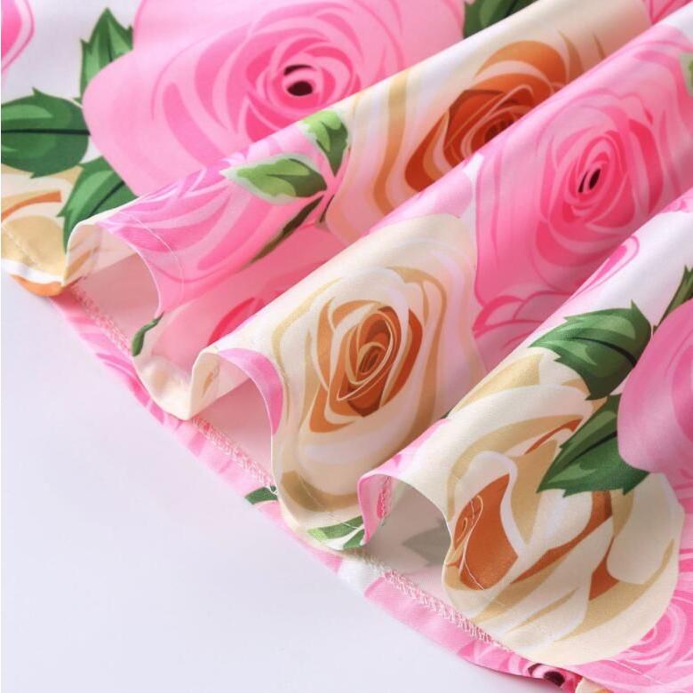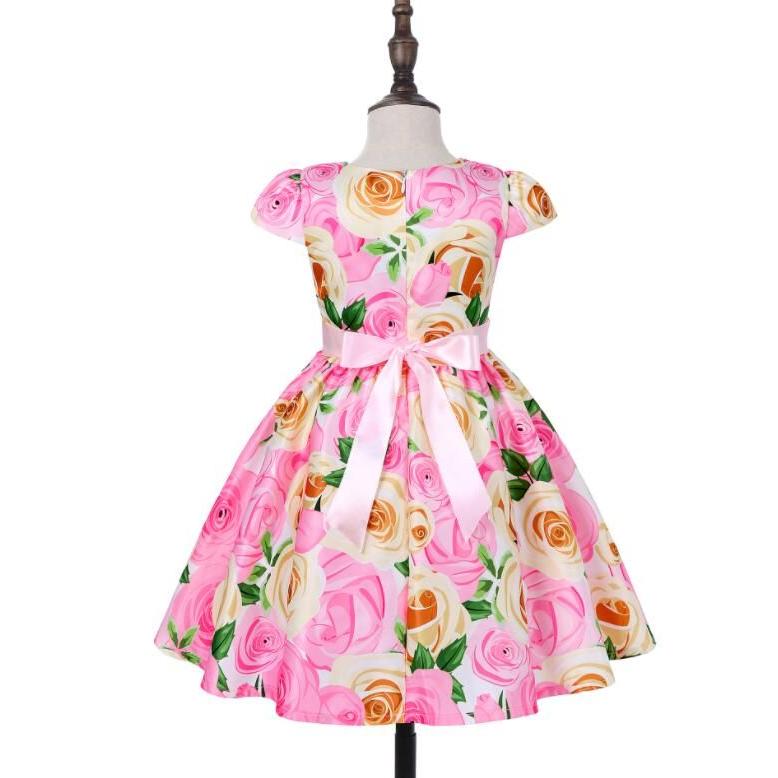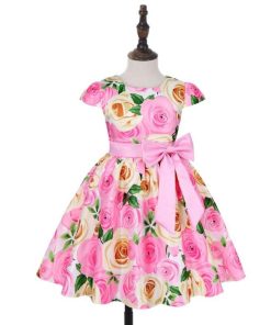子供 ワンピース キッズ ドレス 膝丈 ミモレ丈 お姫様 大きい花柄 薔薇花 総柄 ウエストにリボン キャップ スリーブ 半袖 Aライン 可愛い 女