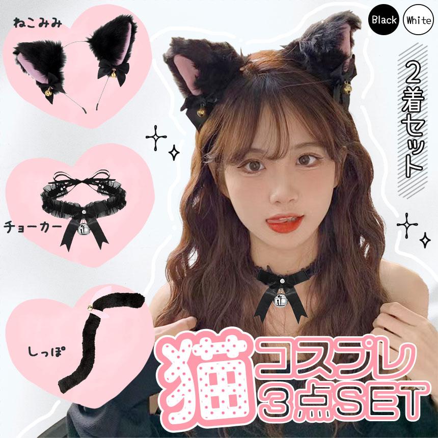 白・黒選べる コスプレ 6点セット 衣装 猫 大人 子ども ハロウィン 仮装 コス ねこ 猫耳 カチューシャ チョーカー 首輪 しっぽ 尻尾 かわいい