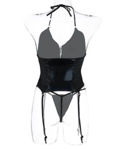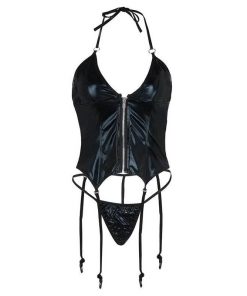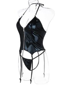 送料無料2〜4日後到着 コスチューム ボンテージ レデース セクシー衣装 エナメル コスプレ 前身頃ファスナー 楽器演奏 ステージ衣装 セクシーなデザイン レザーショーツ付き 黒