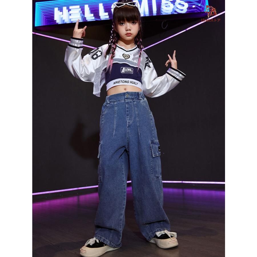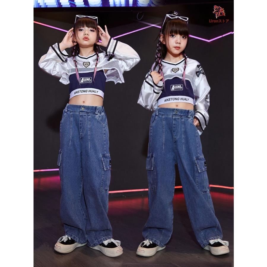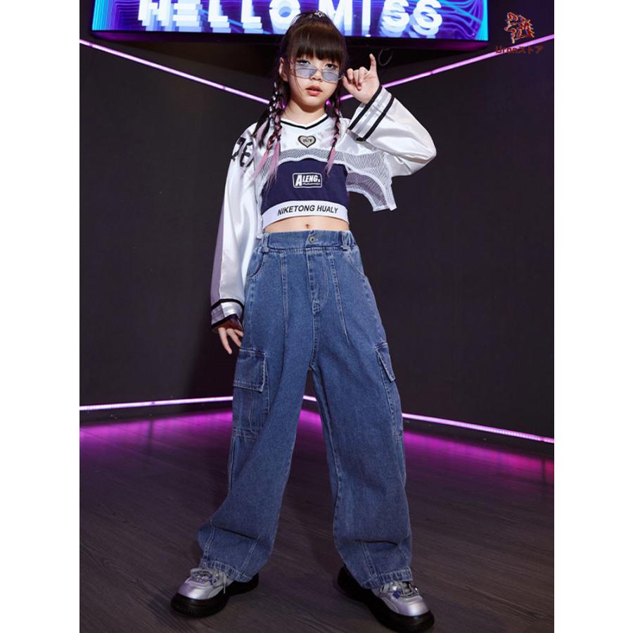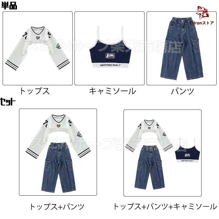 長袖 トップス 紺 キャミソール デニムパンツ キッズ ダンス衣装 セットアップ 上下セット おしゃれ 女の子 かっこいい かわいい カーゴパンツ カジュアル へそ