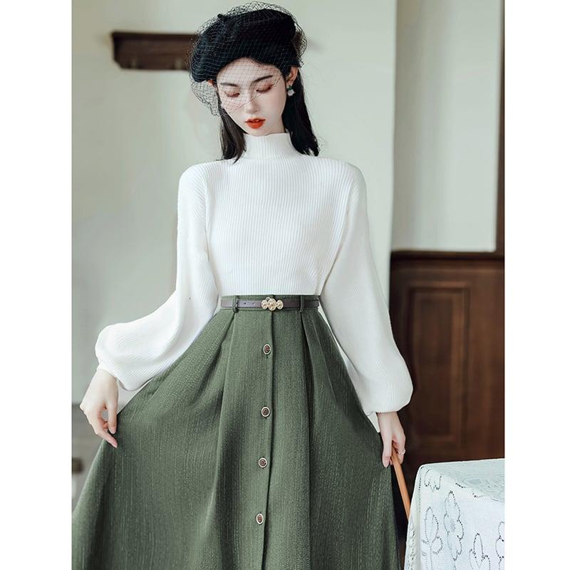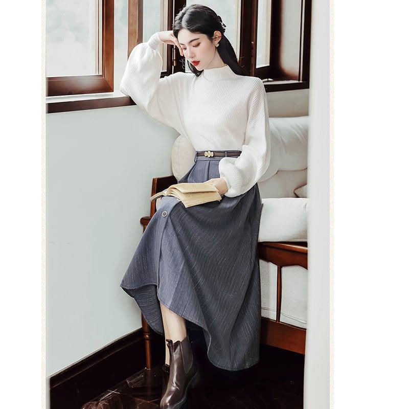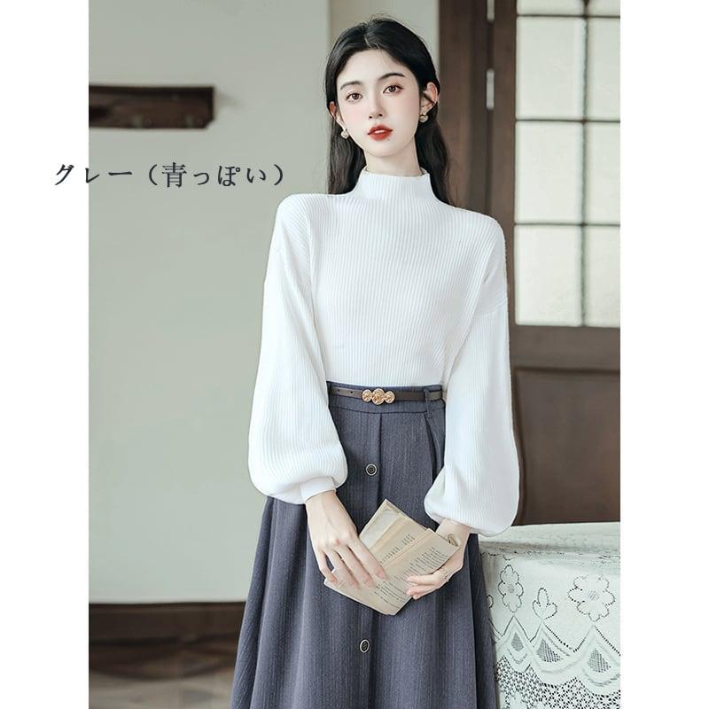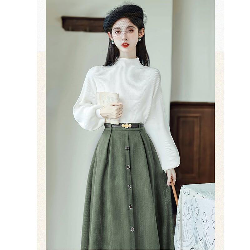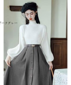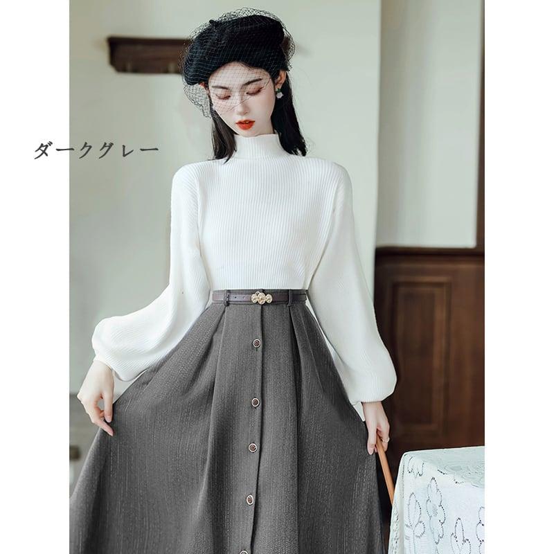 3color ニットトップス+スカート レディース レトロ 上下セット