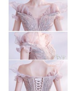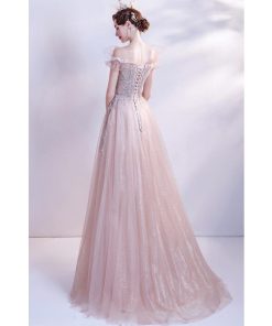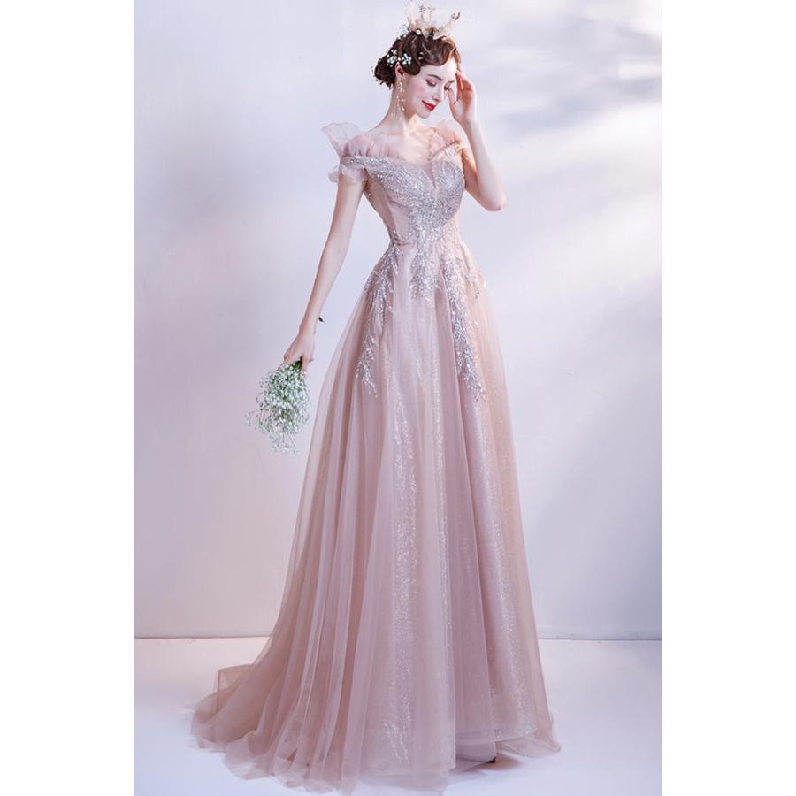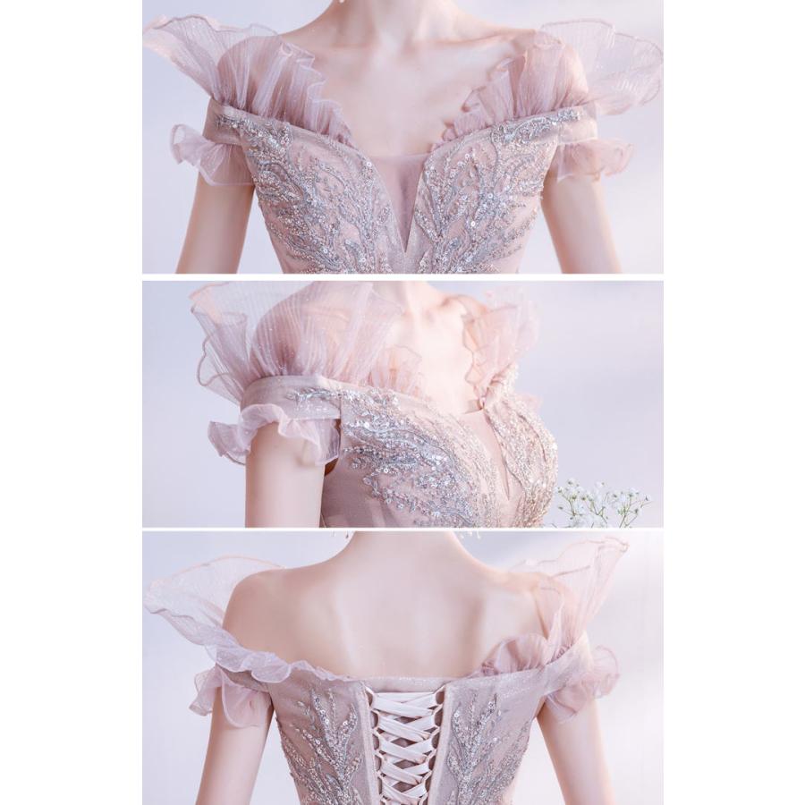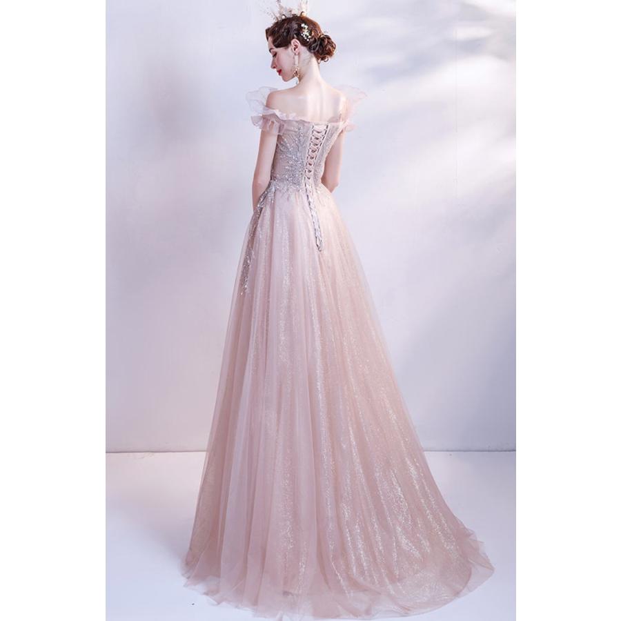 ANGEL オフショルダー ラメ チュール フリル ビーズ スパンコール 背中編上げ Aライン ロングドレス ピンク ロング ドレス パーティードレス