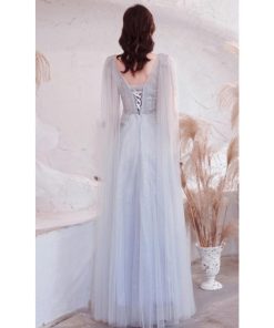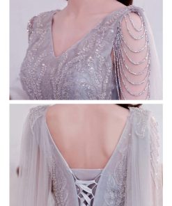 ANGEL Vネック ラメ チュール スパンコール ビーズ ノースリーブ 背中編上げ Aライン ロングドレス グレー 灰色 ロング ドレス パーティー