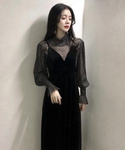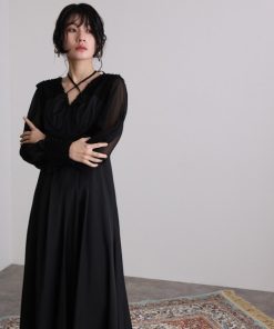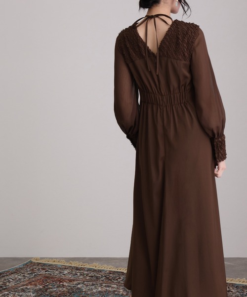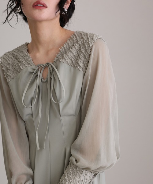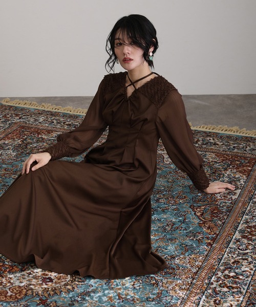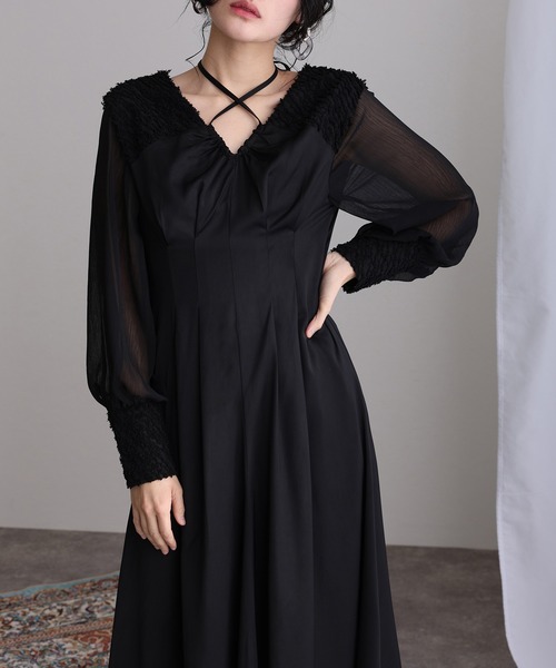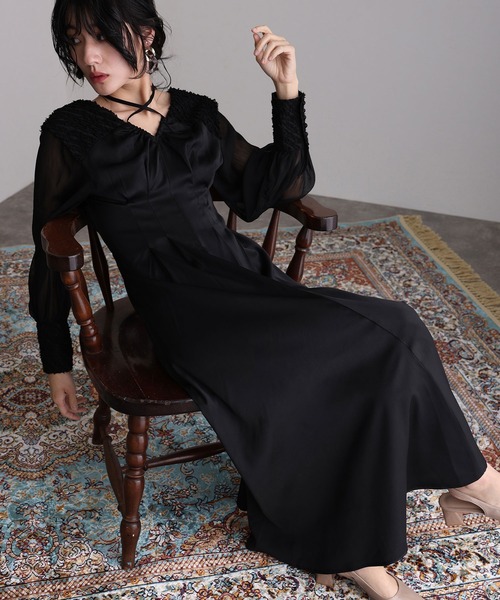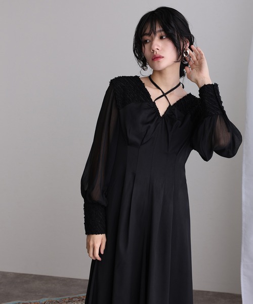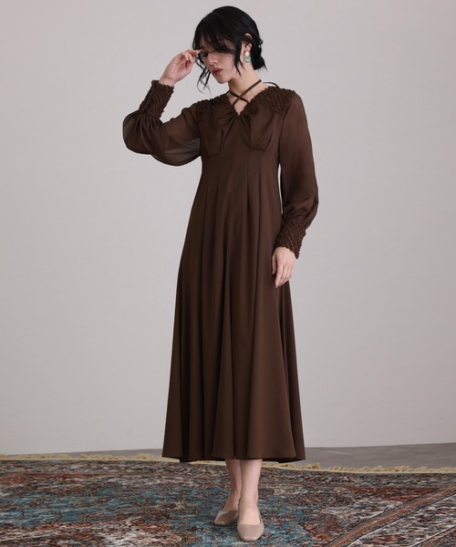 キーワード:ドレス フレア リボン ロング 長袖 無地 WEB限定 エレガント オケージョン キレイめ パーティー フェミニン 結婚式二次会 秋 定番
