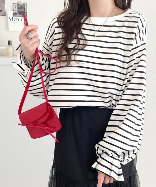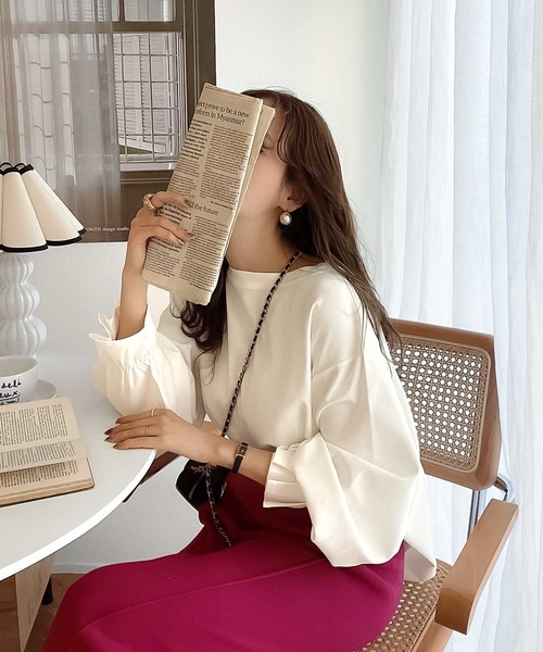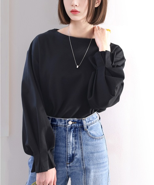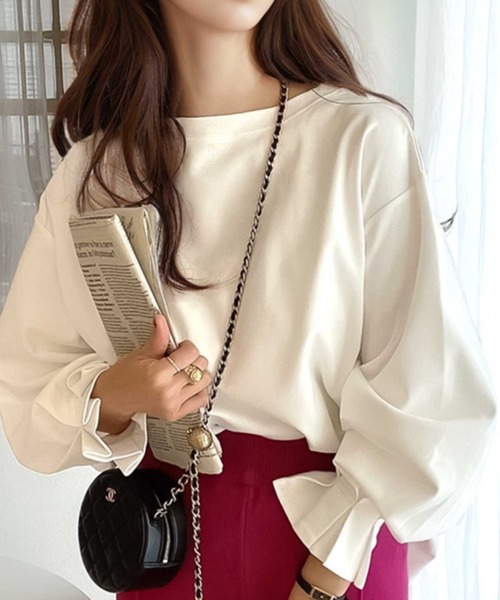 キーワード:tシャツ レディース フリル ボートネック ワンポイント 長袖 無地 WEB限定 オケージョン オフィスカジュアル キレイめ デート フェミニン 秋 春 新生活 定番