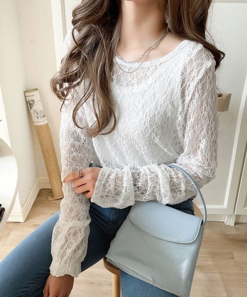 キーワード:tシャツ レディース uネック レース 長袖 無地 WEB限定 エレガント オケージョン キレイめ デート フェミニン 記念日 春 定番