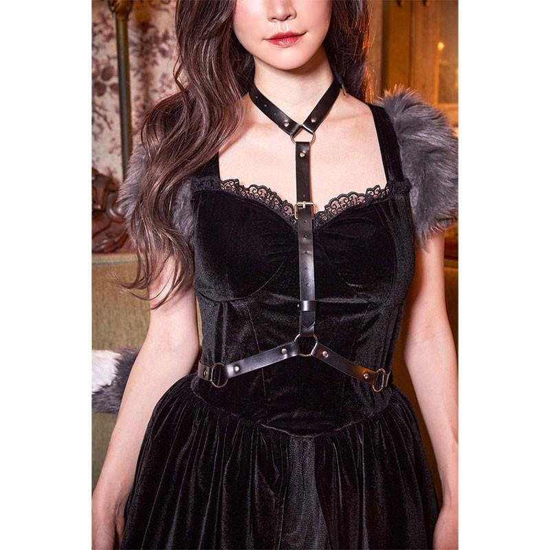 胸元を美しく見せるハーネスベルトが個性的。