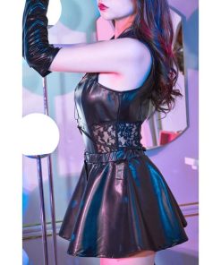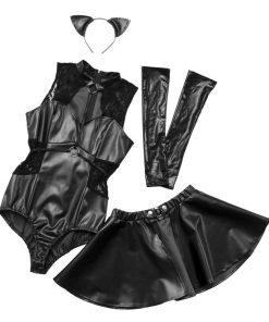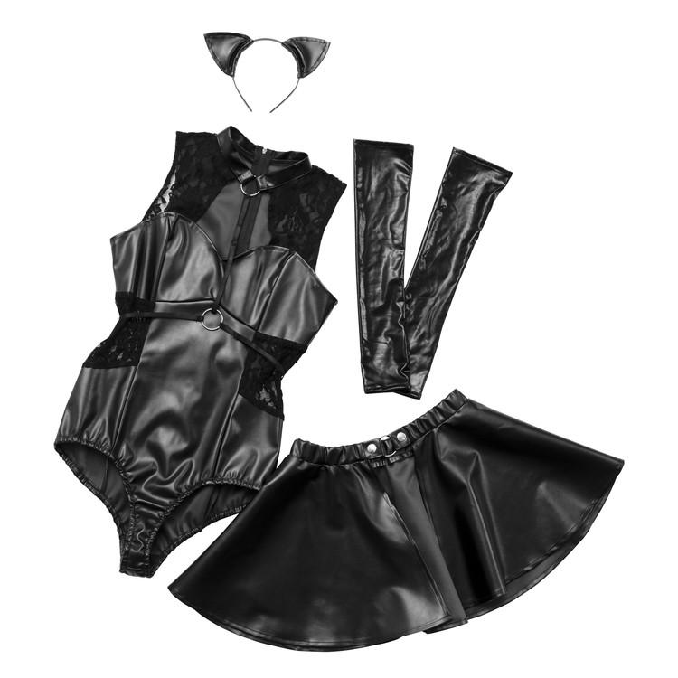 強くてセクシーな女性をイメージしたビターブラックシリーズ。フェイクレザーとレース素材を使用したフェティッシュなキャットウーマンコスチューム。首元から繋がるハーネスはアジャスター付きで身体にフィットするようサイズ調整可能。デコルテとウエスト横はレース素材でレディな印象に。スカートを外してボディスーツのみでも2WAYで着用いただけます。スカートは中央のリング横からスナップボタンで着脱できます。