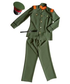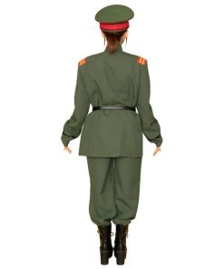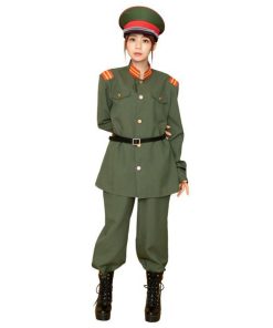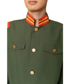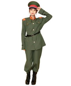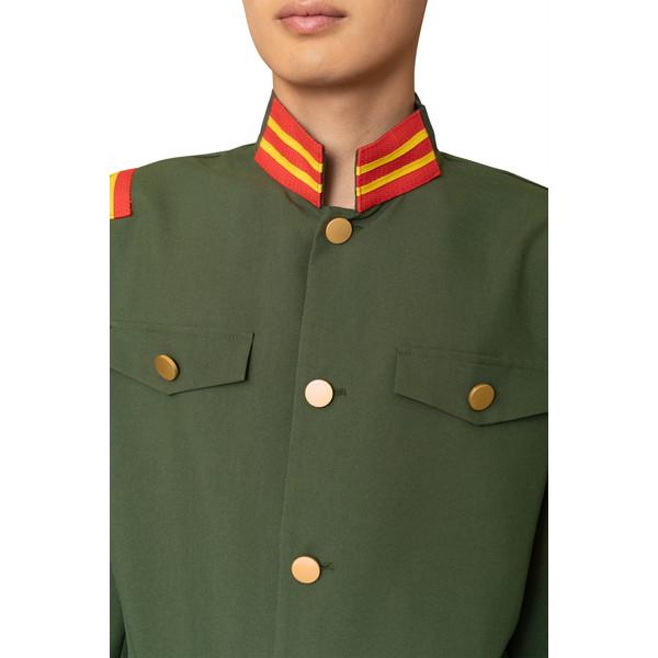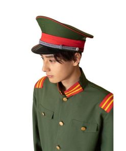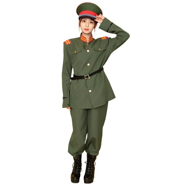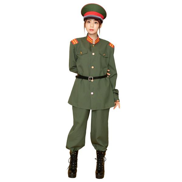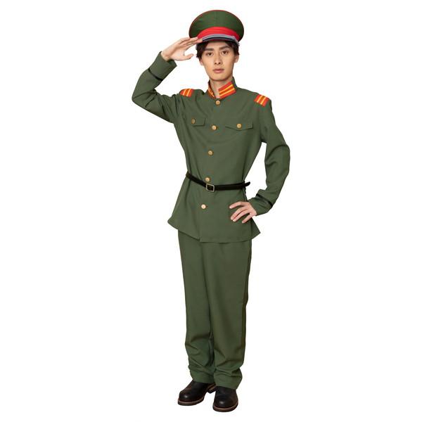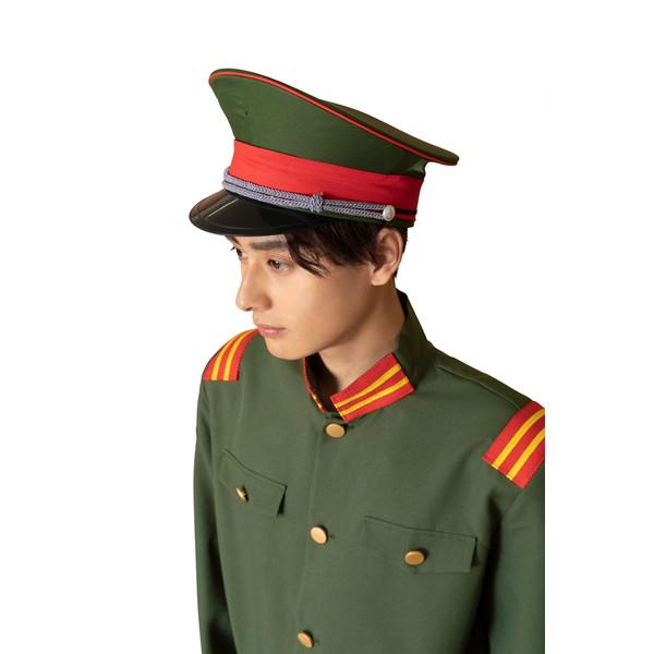 大正ロマンを感じるカーキー色の軍服。襟と肩章の目を引くブレードがポイントです。付属の細いベルトをジャケットの上からしめるのがレトロなカッコ良さ。帽子はしっかりとした作りで高級感があります。