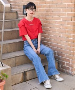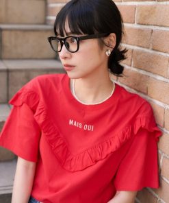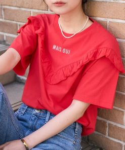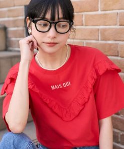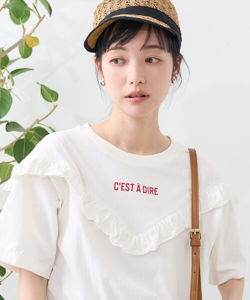 キーワード:tシャツ レディース クルーネック フリル 刺繍 洗える 半袖 無地 ガーリー ピクニック レジャー ベーシック 夏 公園 春 大人カジュアル 旅行