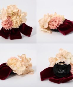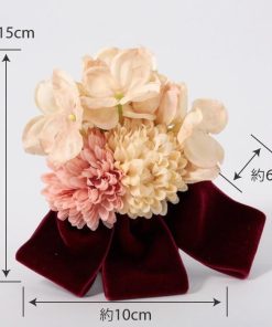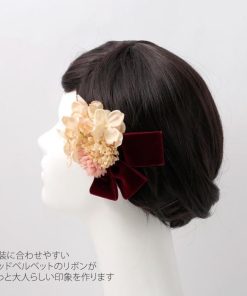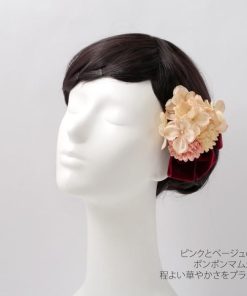 小花が可愛らしく飾りキュンとする横顔を作り出す和装用ヘッドドレス。控えめなベージュのアジサイがおしとやかな雰囲気を作り出しながら、アクセントで入ったポンポンマムと、ワインレッドのベルベットリボンが華やかさをプラス。日本の女性らしさを引き出してくれるヘッドドレスです。