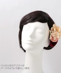 小花が可愛らしく飾りキュンとする横顔を作り出す和装用ヘッドドレス。控えめなベージュのアジサイがおしとやかな雰囲気を作り出しながら、アクセントで入ったポンポンマムと、ワインレッドのベルベットリボンが華やかさをプラス。日本の女性らしさを引き出してくれるヘッドドレスです。