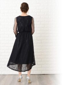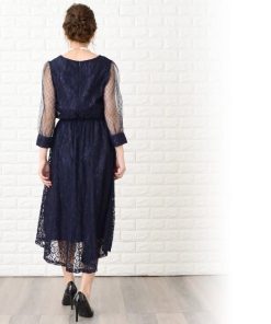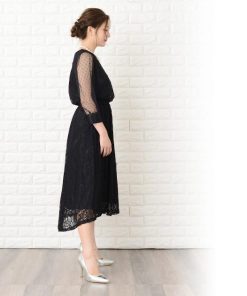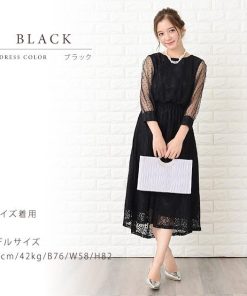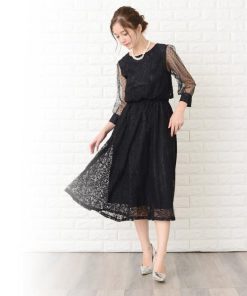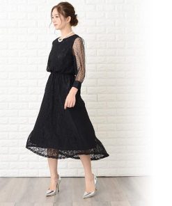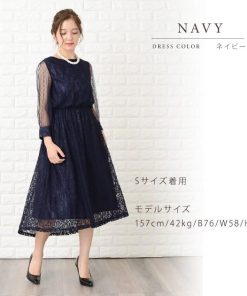Lace Ladies ロングドレス ワンピース レディース 七分袖ドットチュール袖 ミモレ丈 パーティードレス フレアスカート ロング丈 袖あり 他と被らない