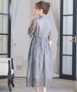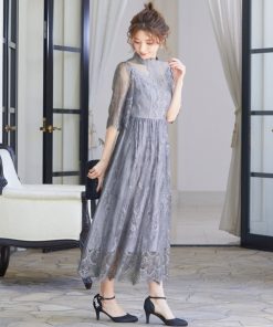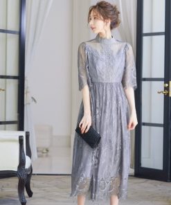 キーワード:ドレス フレア ミモレ丈 刺繍 七分袖 五分袖 エレガント オケージョン ガーリー パーティー フェミニン 結婚式二次会 秋