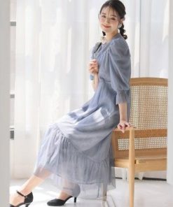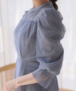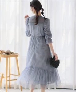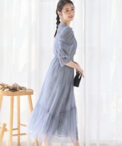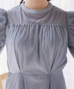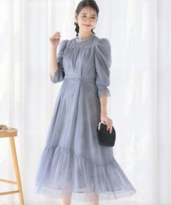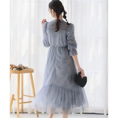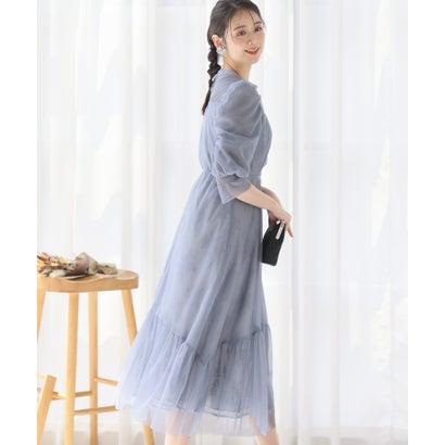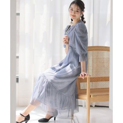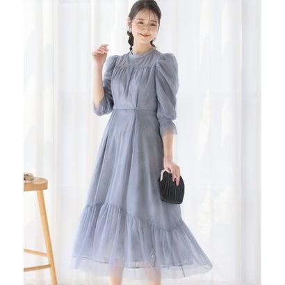 PourVous プールヴー スパンコールパーティードレスセレモニー七分袖&ミモレ丈結婚式フォーマル ワンピース 20代 30代 40代 (ブルーグレ