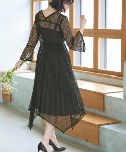商品名:【オケージョンドレス/結婚式】2WAYレースイレヘムプリーツワンピース結婚式 お呼ばれ パーティー ドレス ロング丈 体型カバー 長袖 美脚効果